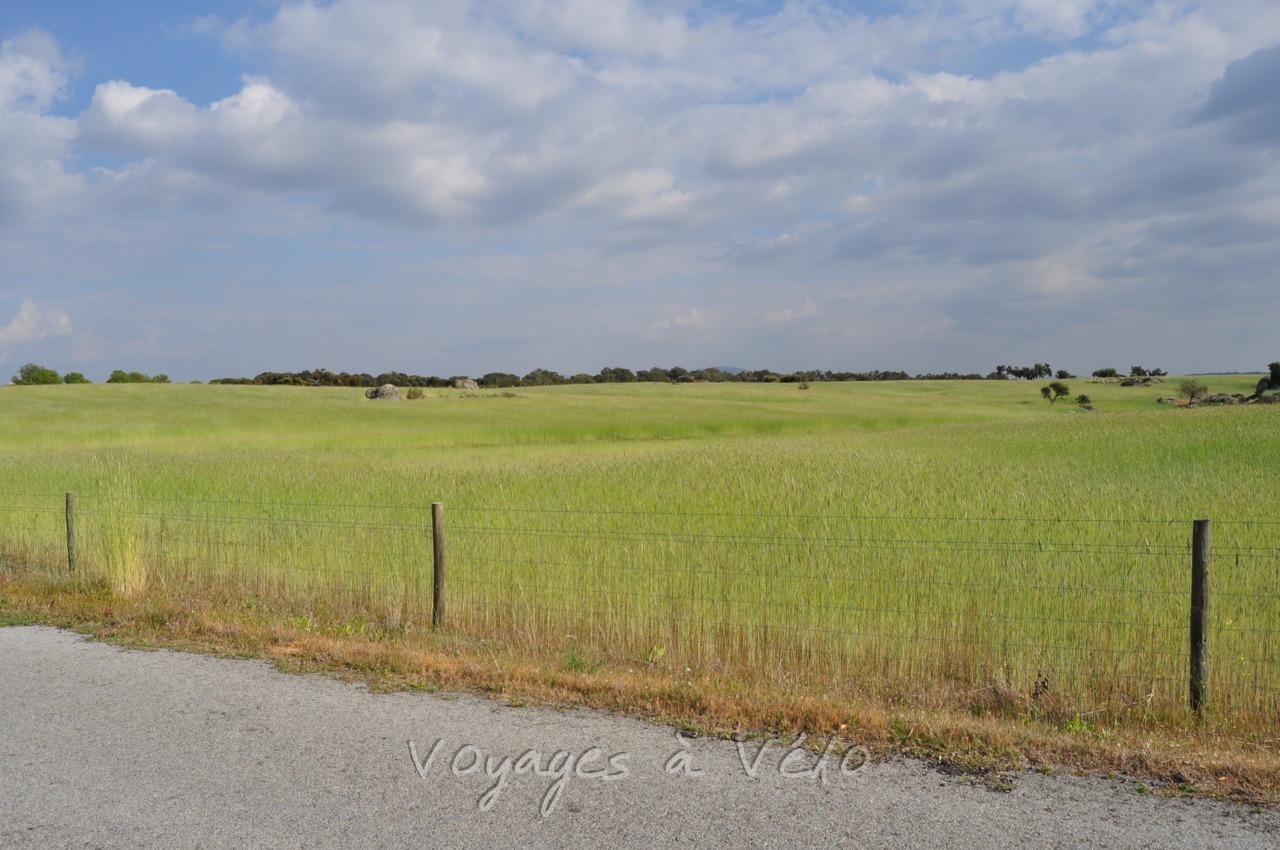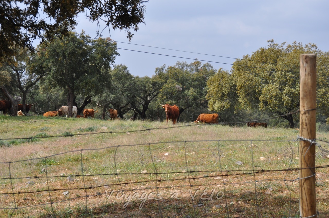 A partir de Vale de Açor era notório a mudança de paisagem. Na opinião do grupo a mudança era positiva. Esperavam-nos longas rectas, umas planas, outras com uma inclinação aceitável. O movimento automóvel na estrada diminuira, comparando com as estradas anteriores, permitindo assim envolver-nos mais na natureza, em poder ouvi-la. Começaram a surgir as herdades com gado bravo.