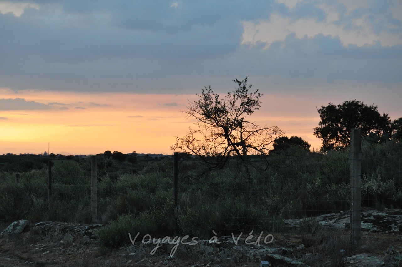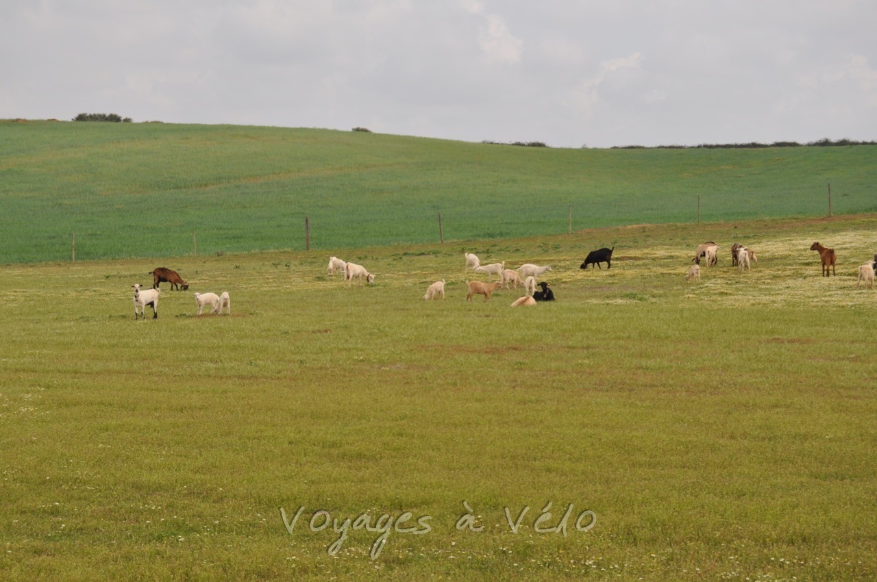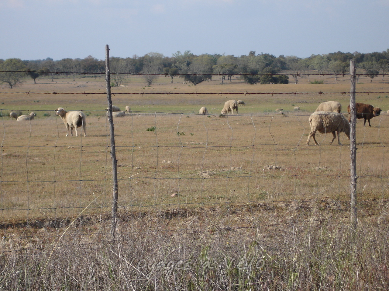 A paisagem ia ficando cada vez mais espectacular. O facto de irmos numa estrada municipal trouxe-nos uma maior sensação de liberdade e segurança. Éramos nós, só nós os seis e a natureza. Por esta estrada as herdades com gado bravo ou os campos com ovelhas e ou cabras eram uma constante. Pelo caminho os pássaros continuaram a ser os nossos companheiros. Os tentilhões destacavam-se muito bem hoje. Lindo! Os grilos também, ao longe no seu cri-cri.