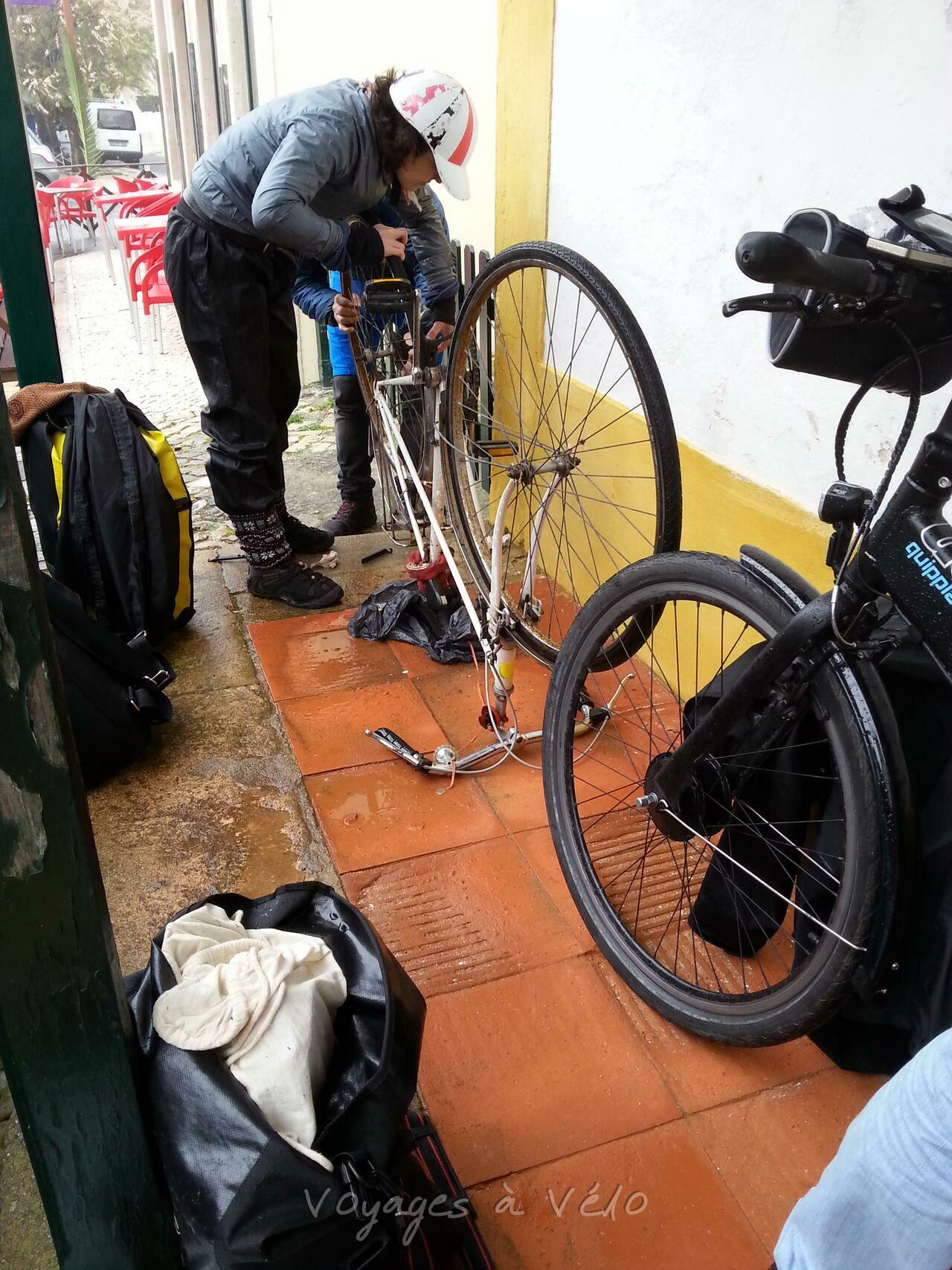 Chegados a São Pedro a bicicleta da M. teve um furo no pneu de trás. Felizmente tinhamos as ferramentas necessárias para resolver o problema.